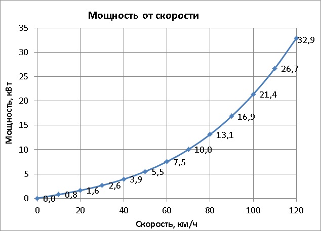 Для того чтобы понять, как мощность зависит от скорости и угла наклона дороги, произведём вычисления в Excel-е и создадим графики (*):